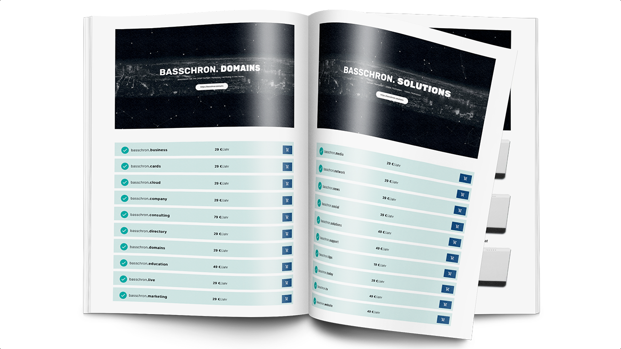 Combine your new registred TLD´s, build and operate the basschron.network. Become a partner and start with the DigiProm® Solutions. Be one of the first by offering fixed placed fullscreen live marketing advertorials for 365 day promotion and relevant search entries.