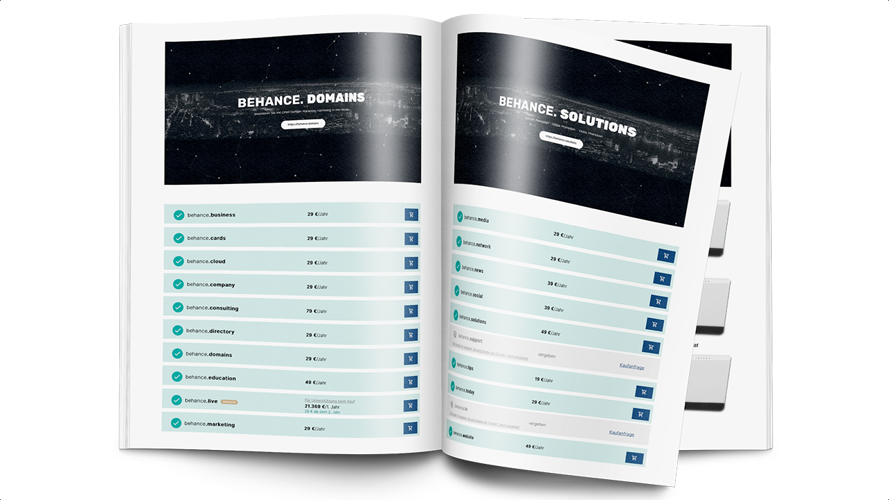 Combine your new registred TLD´s, build and operate the behance.network. Become a partner and start with the DigiProm® Solutions. Be one of the first by offering fixed placed fullscreen live marketing advertorials for 365 day promotion and relevant search entries.