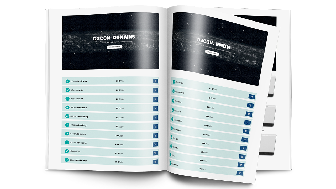 Combine your new registred TLD´s, build and operate the d3con.network. Become a partner and start with the DigiProm® Solutions. Be one of the first by offering fixed placed fullscreen live marketing advertorials for 365 day promotion and relevant search entries.