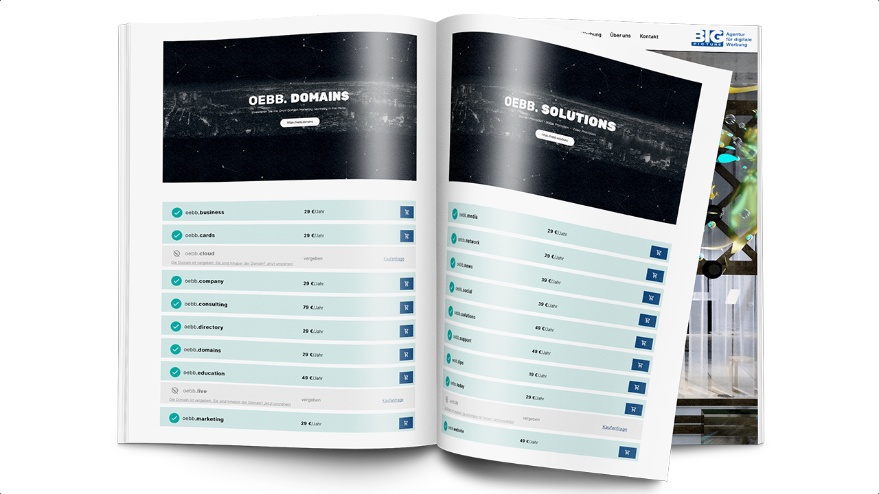 Combine your new registred TLD´s, build and operate the oebb.network. Become a partner and start with the DigiProm® Solutions. Be one of the first by offering fixed placed fullscreen live marketing advertorials for 365 day promotion and relevant search entries.