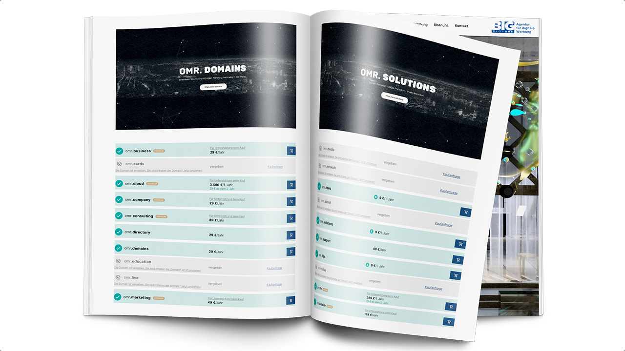 Combine your new registred TLD´s, build and operate the omr.network. Become a partner and start with the DigiProm® Solutions. Be one of the first by offering fixed placed fullscreen live marketing advertorials for 365 day promotion and relevant search entries.